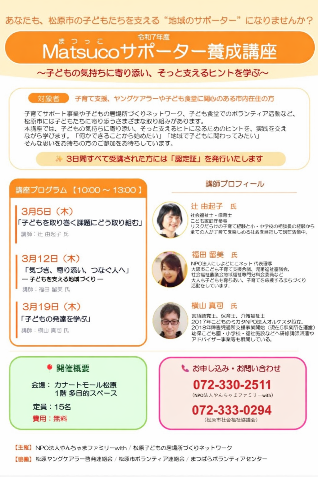 「学校や家庭、地域で不安や悩みを抱えながらもうまく助けを求められない子どもたち」が、本人らしく生きていけるような地域社会を目指し、子どもたちのために、自分自身ができることを一緒に考える機会になればと思います。是非ともご参加ください! 日時:1/28(水)15:45~ 会場:まつばらテラス(輝)詳細は下記チラシをご参照ください