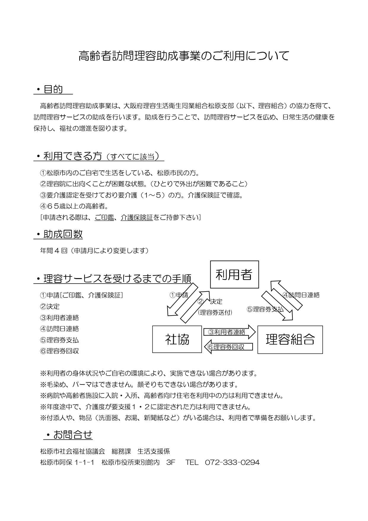 外出が困難な方を対象に、大阪府理容生活衛生同業組合松原支部の協力を得て、訪問理容サービスの助成を行なっています。